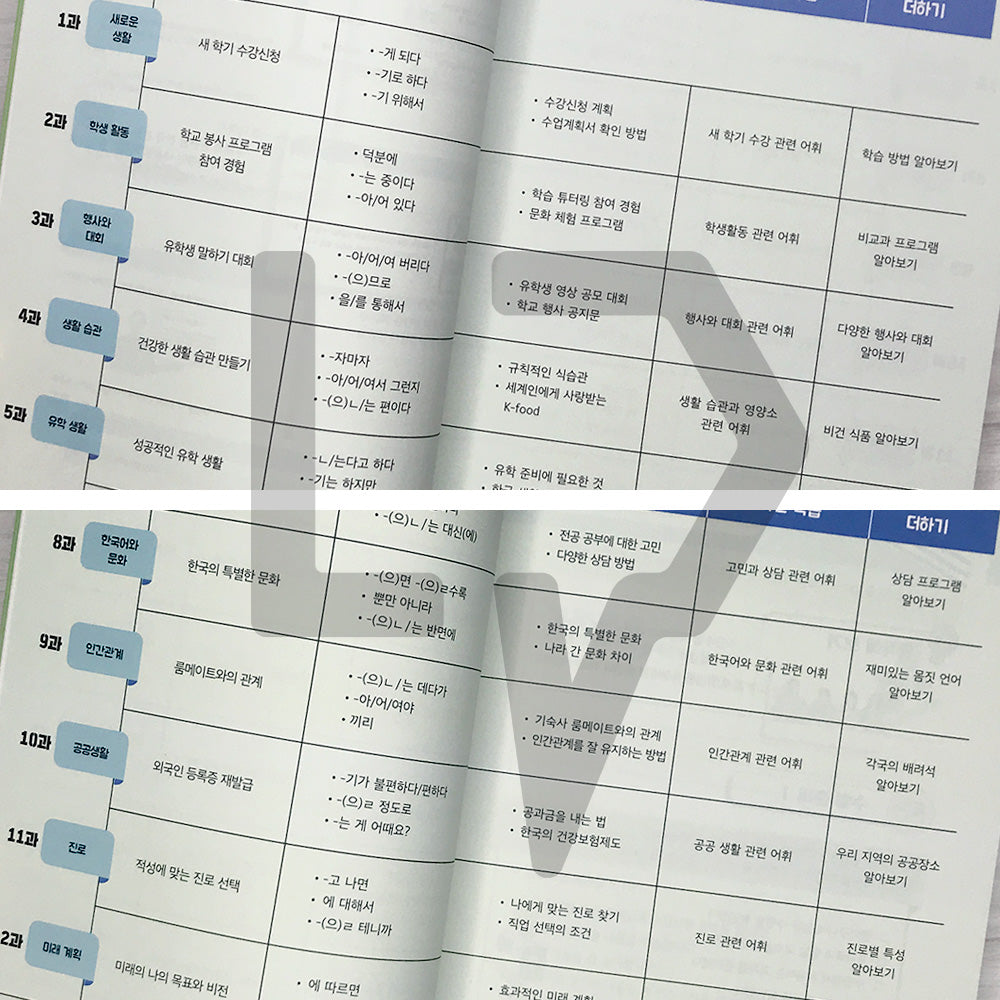 First, the textbook balances topics for academic success and daily university life. It covers essential topics for new international students, such as preparing for classes, course registration, participation in on- and off-campus programs, major-related concerns, and career planning—providing guidance for a seamless semester. Life Pattern Korea. Additionally, it addresses daily life topics, including habits, interpersonal relationships, understanding Korean language and culture, and navigating public services, helping students communicate effectively in everyday campus situations.