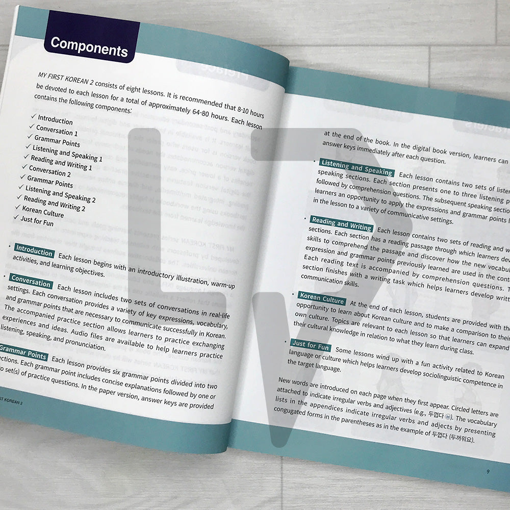 The My First Korean series by Siwon School integrates a main textbook and workbook for a comprehensive learning experience. Life Pattern Korea. This series was developed for foreigners who are new to the Korean language, consisting of My First Korean 1 for the Beginner level, My First Korean 2 for the Intermediate level, and My First Korean 3 for the Advanced level.