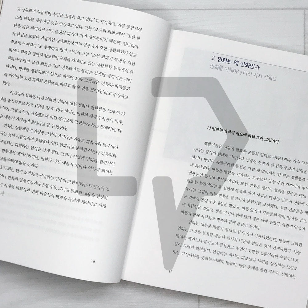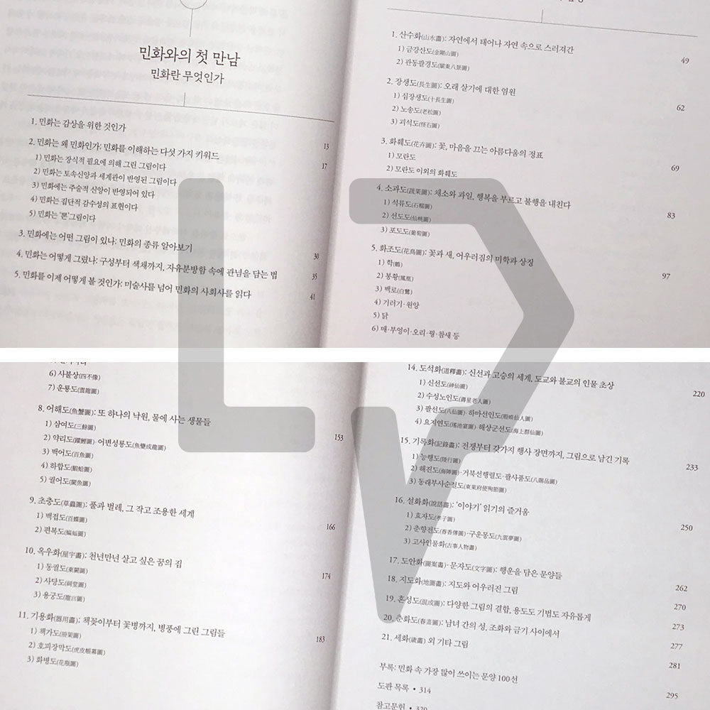 First, it helps to understand the characteristics of styles based on ‘decoration, native faith and worldview, magic faith, collective sensitivity, and pattern’ as five keywords to understand Minhwa. And specifically, it examines how Minhwa were drawn, and the overall characteristics of composition and color. Through this, we can get a glimpse of our ancestors' ‘how to contain ideas in freewheeling’. In addition, the types of Minhwa are classified into about 20 types, and the characteristics of each type and various paintings are introduced.
