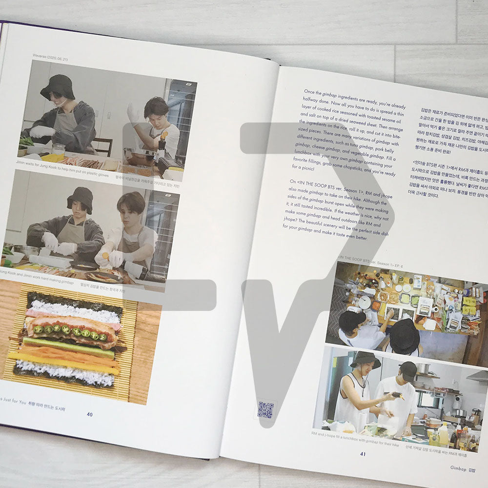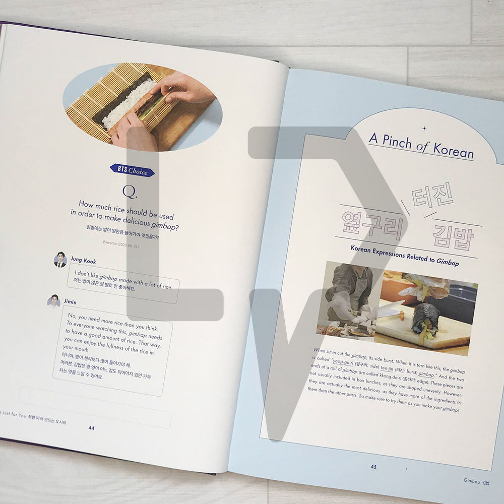 The recipe part was basically organized based on the recipe of the BTS, and detailed recipes such as the exact amount of ingredients were prepared with the opinions of cooking experts. For ARMY, who are unable to obtain Korean ingredients, alternative ingredients are marked so that they can taste as similar as possible. If each dish can be cooked vegan or gluten-free, the recipe was guided together. Finally, BTS's special tip was provided so that the dish could be completed more deliciously by following their guidance.