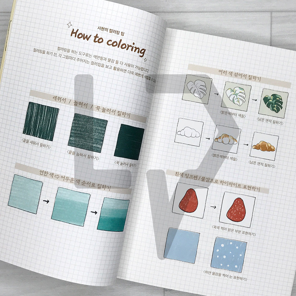 Each illustration includes coloring tips from Sihyun to help readers who are new to coloring achieve good results. Life Pattern Korea. The book also provides methods for creating dimensional color effects that resemble watercolor painting, described with friendly guidance.