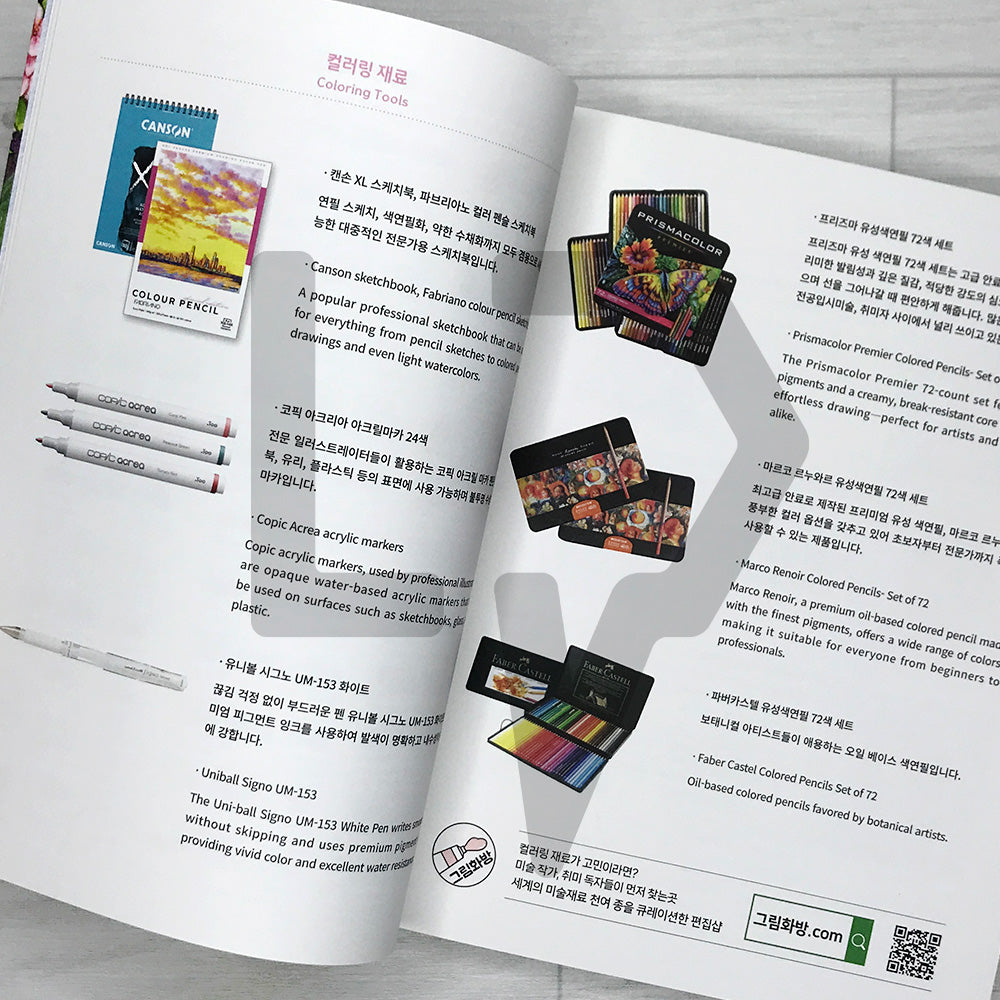 Printed on thick, high-quality paper, the book works beautifully with colored pencils, watercolors, markers, and more. It also contains the artist's finished color examples, adding fun to exploring color combinations or discovering your own color style. The special binding opens fully at 180 degrees, making the coloring experience easy and comfortable. Life Pattern Korea.